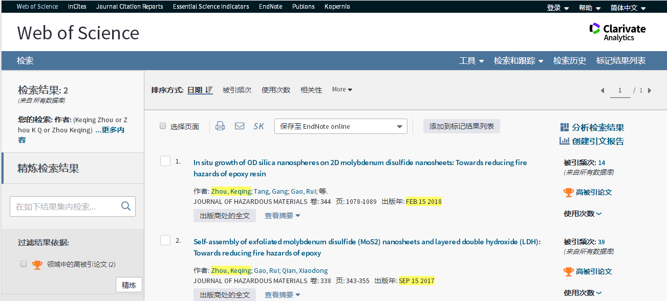 基本科学指标数据库(Essential Science Indicators,简称ESI)最新数据显示,安全工程系周克清老师发表的论文“In situ growth of 0D silica nanospheres on 2D molybdenum disulfide nanosheets: Towards reducing fire hazards of epoxy resin”入选高被引论文。该论文是周克清老师以beat365正版唯一官方网站(武汉)beat365正版唯一官方网站为第一单位、第一作者和通讯作者身份发表的第2篇ESI高被引论文。2018年7月周克清老师发表的论文“Self-assembly of exfoliated molybdenum disulfide (MoS2) nanosheets and layered double hydroxide (LDH): Towards reducing fire hazards of epoxy”曾同时入选ESI高被引论文和热点论文。