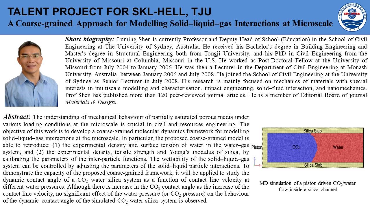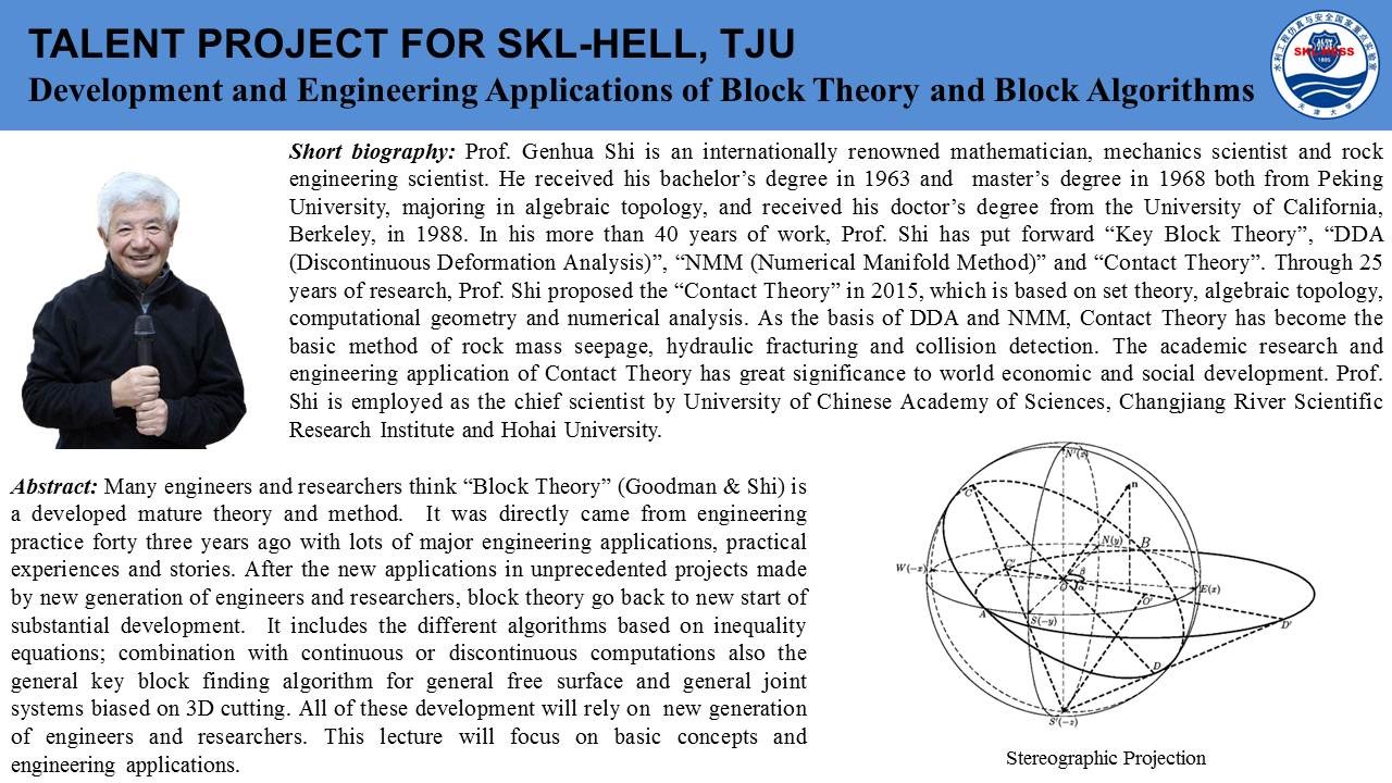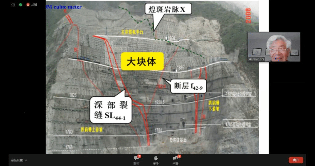 beat365正版唯一官方网站院长焦玉勇教授作为国际岩石力学与岩石工程学会非连续变形分析专委会主席牵头组织并主持了此次云论坛会议,石根华教授基于数十年的关键块体理论研究工作,介绍了关键块体理论的发展、基本原理及采用赤平投影方法将2D关键块体理论拓展的3D关键块体理论,并且用多个实际工程演示了关键块体理论的坝基、硐室分析应用;赵坚教授以岩石动力学实验及实验设备为出发点,简述了霍普金森杆(SHPB)在高加载率动力学实验中的应用和真三轴SHPB的发展过程及其特性与应用领域;沈鲁明教授以气-液-固一体化微观数值计算方法为核心,介绍了CGMD(coarse-grained molecular dynamic)数值方法,详细阐述了CGMD中多相相互作用关系,并以数值实验对CGMD进行验证,最后介绍了CGMD方法模拟CO2-水-SiO2系统各相介质之间的相互作用。