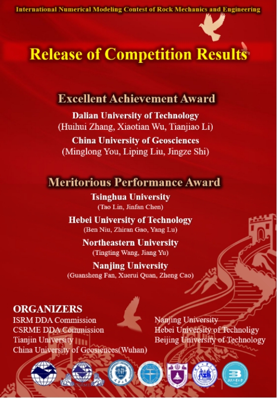 本次大赛由国际岩石力学与岩石工程学会非连续变形分析专委会(ISRM DDA)联合中国岩石力学与工程学会岩土体非连续变形分析专委会(CSRME DDA)及beat365正版唯一官方网站(武汉)、天津大学、南京大学、北京工业大学、河北工业大学等多所高校联合举办,于2021年第十一届亚洲岩石力学大会(ARMS11)期间同步举行。大赛鼓励研究生对岩石力学问题的现有数值方法和软件进行公开、透明和广泛的验证,为共享岩石力学问题的实验和数值结果提供平台。