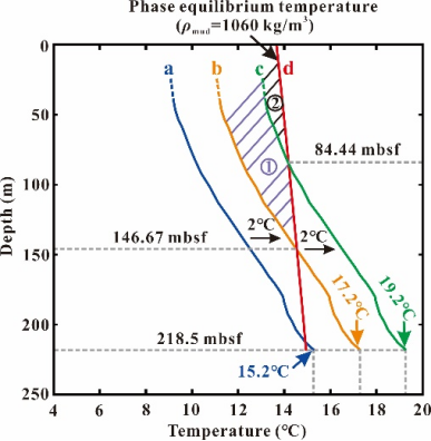 研究表明,地层束缚水饱和度高低会显著影响钻井液侵入状况,在该站位钻进时,采用合适的钻井液温度,出现井壁坍塌的可能性不大,但易发生因井周应力释放出现的卡钻事故(图2);钻井液温度是影响井周水合物分解和管线内二次水合物生成的主控因素(图3);在没有发生明显钻井液滤失的情况下,在安全密度窗口范围内增加钻井液的密度和盐度仅会轻微地促进水合物分解,但分解造成的力学强度下降对井壁稳定的影响要远远弱于钻井液的护壁作用;通过对比分析可知,水平井可优先布设在高水合物饱和度层,这样更有利于维持井壁稳定,当其布设在低水合物饱和度层时,在适宜的钻井液温度下,在井筒形成低渗泥皮有助于保持井壁稳定。