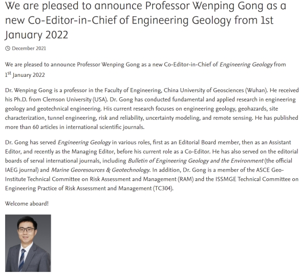 (通讯员:黄静)近日,beat365正版唯一官方网站龚文平教授受邀担任国际期刊Engineering Geology共同主编(Co-Editor-in-Chief)。龚文平教授的此次任职将有助于促进我校在工程地质相关领域与国内外学者的交流合作,并提升我校在工程地质相关领域的国际影响力。