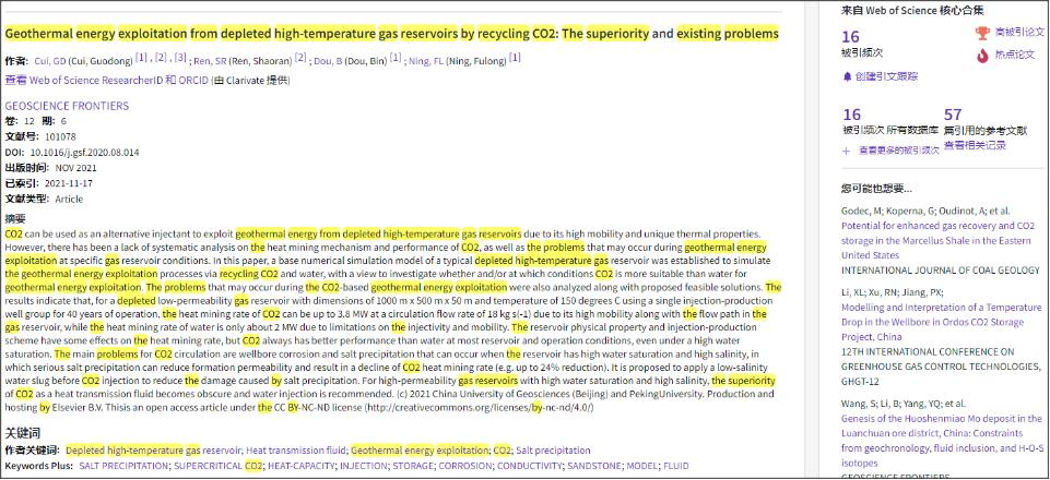 (通讯员:黄静)根据2022年3月基本科学指标数据库(Essential Science Indicators,简称ESI)最新数据显示,beat365官网崔国栋副教授于2021年在国际地学期刊Geoscience Frontiers上发表的学术论文“Geothermal energy exploitation from depleted high-temperature gas reservoirs by recycling CO₂: The superiority and existing problems”入选ESI热点和高被引论文(Hot and Highly Cited Paper)。该论文第一作者兼通讯作者为崔国栋副教授,beat365正版唯一官方网站(武汉)beat365正版唯一官方网站为第一署名单位。