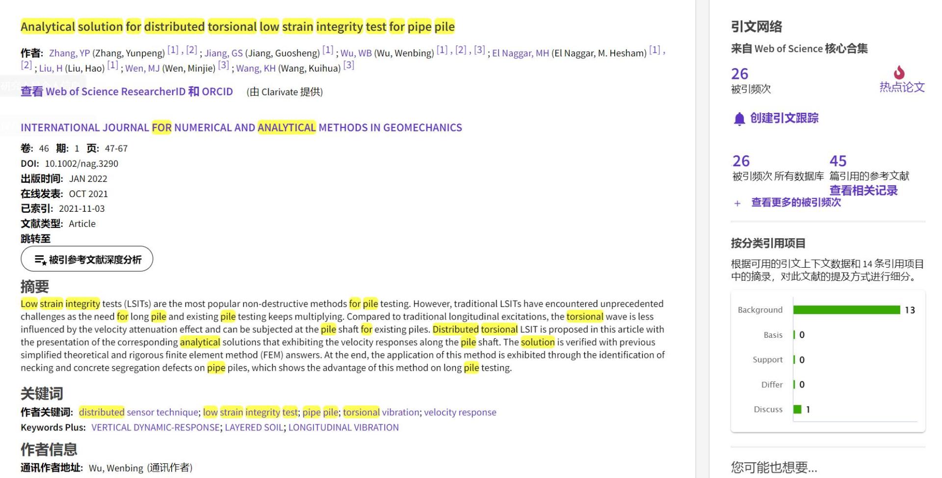 (通讯员 黄静)根据2022年9月基本科学指标数据库(Essential Science Indicators,简称ESI)最新数据显示,beat365正版唯一官方网站勘察与基础工程系吴文兵教授团队于2021年在国际岩土工程数值计算权威期刊International Journal for Numerical and Analytical Methods in Geomechanics上发表的学术论文“Analytical solution for distributed torsional low strain integrity test for pipe pile”入选ESI热点论文(Hot Paper)。该论文第一作者为2020级博士研究生张云鹏,通讯作者为吴文兵教授,beat365正版唯一官方网站(武汉)beat365正版唯一官方网站为第一署名单位。
