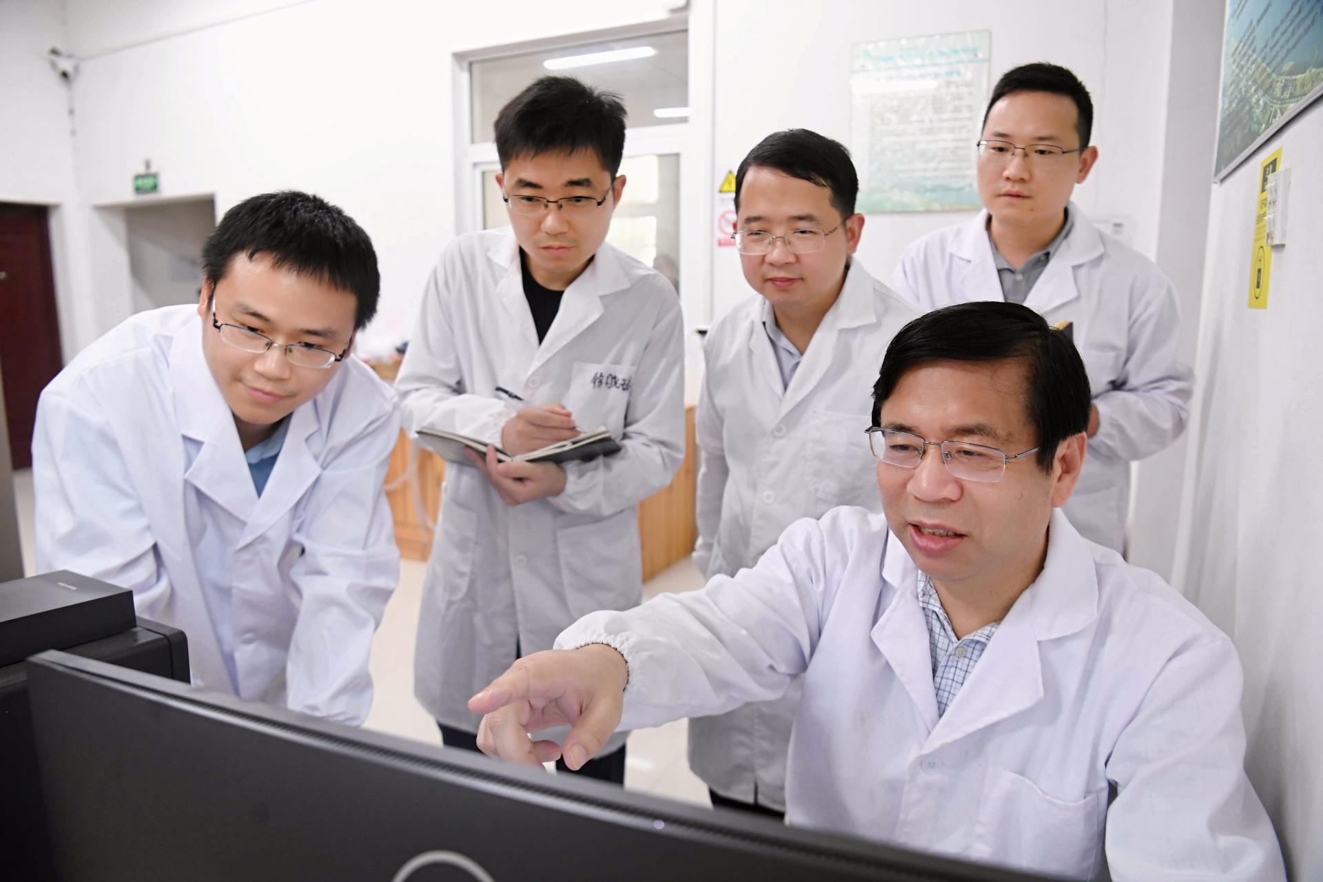 地质工程学科首席教授唐辉明(右一)团队在研究岩石力学试验数据 高勇 摄