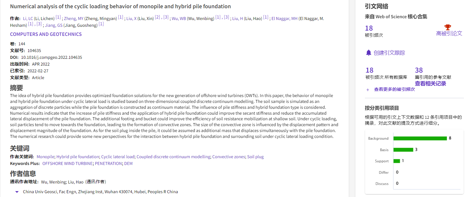 根据2022年11月基本科学指标数据库(Essential Science Indicators,简称ESI)最新数据显示,beat365正版唯一官方网站勘察与基础工程系吴文兵教授团队于2022年在国际岩土工程数值模拟权威期刊Computers and Geotechnics上发表的学术论文“Numerical analysis of the cyclic loading behavior of monopile and hybrid pile foundation”入选ESI高被引论文。该论文第一作者为勘察与基础工程系博士后李立辰,通讯作者为吴文兵教授,beat365正版唯一官方网站(武汉)beat365正版唯一官方网站为第一署名单位。