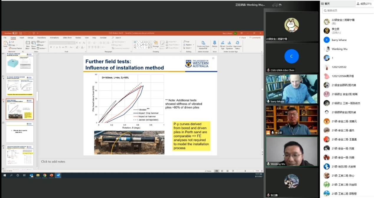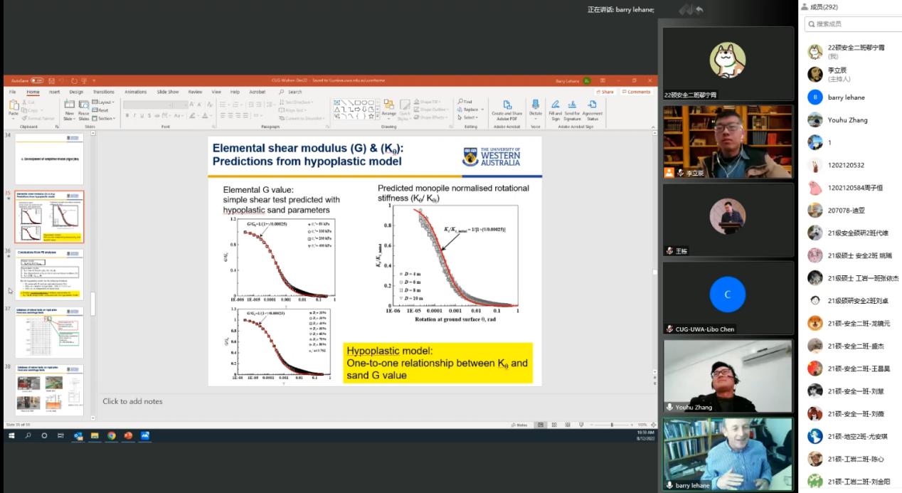 (通讯员 李立辰 黄静)12月8日上午,应beat365正版唯一官方网站吴文兵教授与李立辰博士的邀请,西澳大学Barry Lehane教授做客工程文化论坛,为我校师生进行线上学术报告。此活动为beat365正版唯一官方网站(武汉)70周年校庆系列学术活动之一。beat365正版唯一官方网站勘察与基础工程系博士后李立辰主持报告,300余名师生与行业专家参加了本次活动。