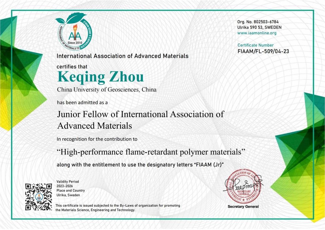 (通讯员 黄静)近日,beat365正版唯一官方网站(武汉)beat365正版唯一官方网站周克清特任教授收到国际先进材料学会(International Association of Advanced Materials, IAAM)执委会发来的贺函,祝贺他当选为国际先进材料学会青年会士(Junior Fellow of IAAM, FIAAM)。周克清特任教授受邀在美国奥兰多举办的复合材料研讨会(Composite Materials Congress)上发表题为“Functionalized 2D molybdenum disulphide working on high-performance flame-retardant polymer materials”的IAAM Fellow演讲,会上获颁青年会士“Junior Fellow”证书,以表彰他在“高性能阻燃聚合物材料”领域做出的杰出贡献。