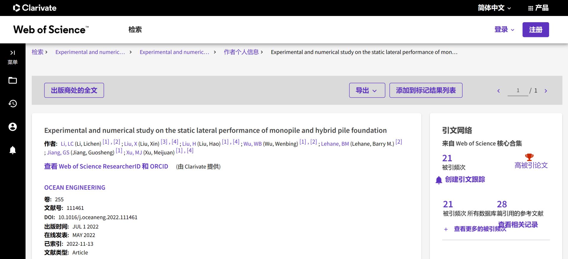 (通讯员 吴文兵)根据2023年6月基本科学指标数据库(Essential Science Indicators,简称ESI)最新数据显示,beat365正版唯一官方网站勘察与基础工程系蒋国盛教授团队于2022年在国际海洋岩土领域权威期刊Ocean Engineering上发表的学术论文“Experimental and numerical study on the static lateral performance of monopile and hybrid pile foundation”入选ESI高被引论文。该论文第一作者为勘察与基础工程系博士后李立辰,通讯作者为吴文兵教授,beat365正版唯一官方网站(武汉)beat365正版唯一官方网站为第一署名单位。