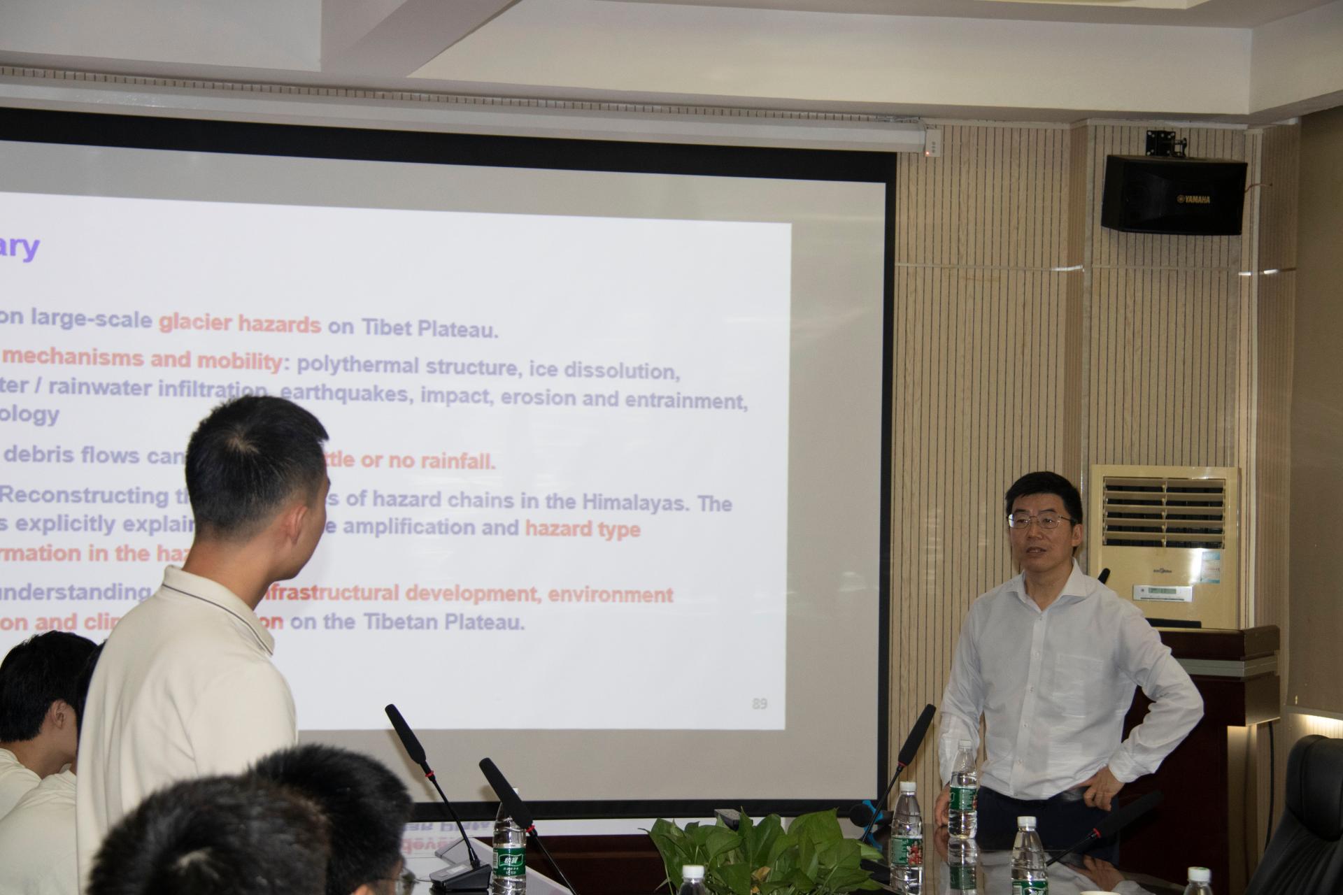 张利民教授作了题为“冰川滑坡灾害链”的学术报告,从物理力学的角度对冰川滑坡灾害链完整过程进行了科学阐释,包括冰川沉积物和岩体在冻融循环下的稳定性丧失、冰溶解过程中的土壤行为、质量流体动力学、碎屑冲击的动态响应以及滑坡灾害链中灾害类型的演变。