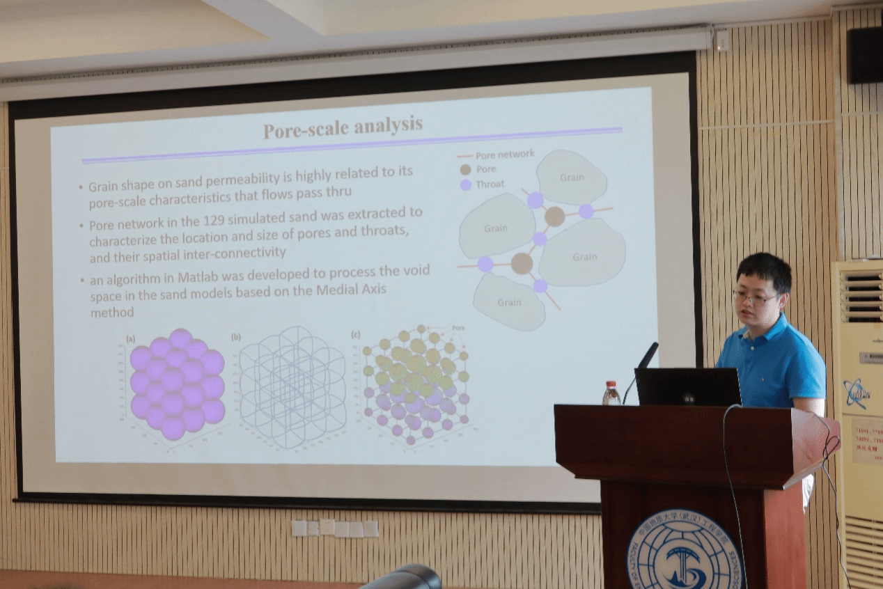郑文博助理教授作了题为“Grain morphology on sand hydraulic conductivity: a detailed pore-scale study”的报告。他介绍了Kozeny-Carman方程在渗流模拟中的应用,指出可通过粒子形貌参数估算形状因子;结合三维扫描等多种研究手段,深入剖析了颗粒球形度、棱角性与表面粗糙度等形貌特征对砂土渗透性的重要影响。他指出砂土渗流特性受“孔喉”各向异性显著影响,颗粒的棱角度与表面凹凸形态会增加水力曲折度并提高有效渗透系数;而高凸度、高球形度的颗粒则更易构成孔径均匀、变化小的孔隙结构,从而提升整体渗透性。同时还指出模拟细粒迁移和复杂孔隙结构演变过程中渗透性变化的研究仍存在挑战,值得深入探索。