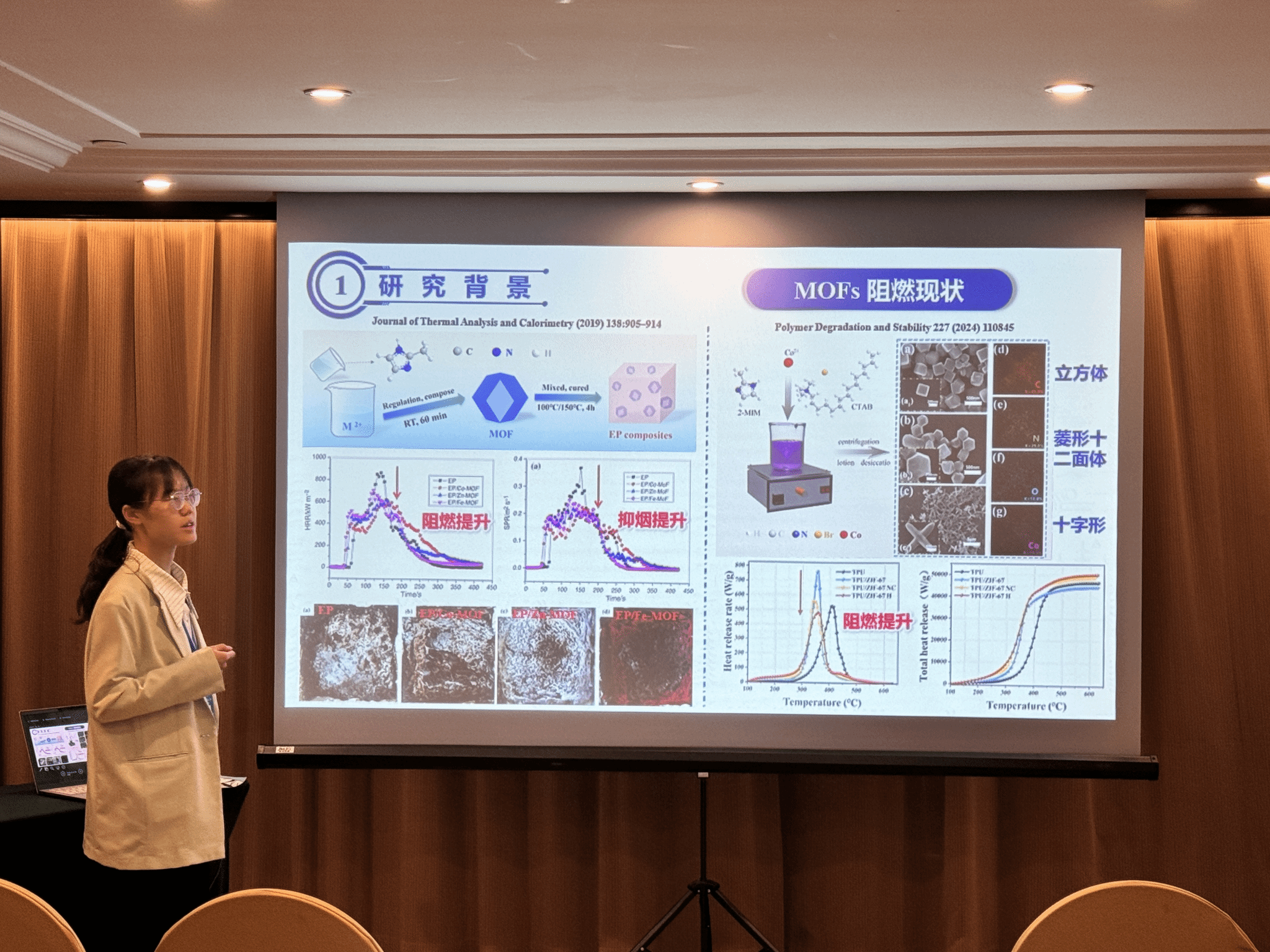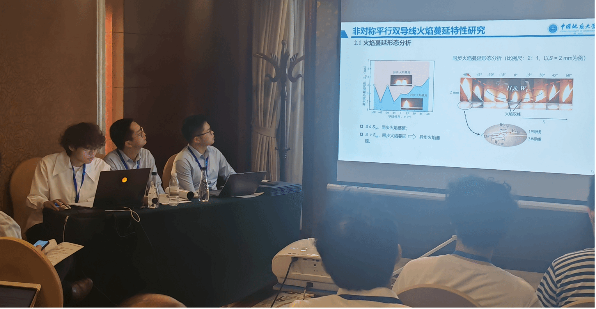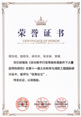 此外,beat365官网研究生印恋在阻燃耐火论坛作题为“卟啉基有机框架衍生物分子设计及其阻燃增韧研究”报告、罗瑊瑊在阻燃耐火论坛作题为“生物启发微中空MOFs的界面锁定效应:环氧树脂复合材料的耐火与增韧性能优化研究”报告、缪汝成在火灾机理论坛作题为“非对称平行双导线布局条件下火蔓延特性研究”报告,孟祥龙在火灾烟气论坛作题为“空气幕射流作用下的开口溢流发展行为研究”报告,宗志伟在受限空间火灾论坛作题为“墙角型壁面限制条件下的火羽流行为特性研究”报告。其中,陆凯华副教授指导的硕士研究生缪汝成获得会议优秀论文奖。