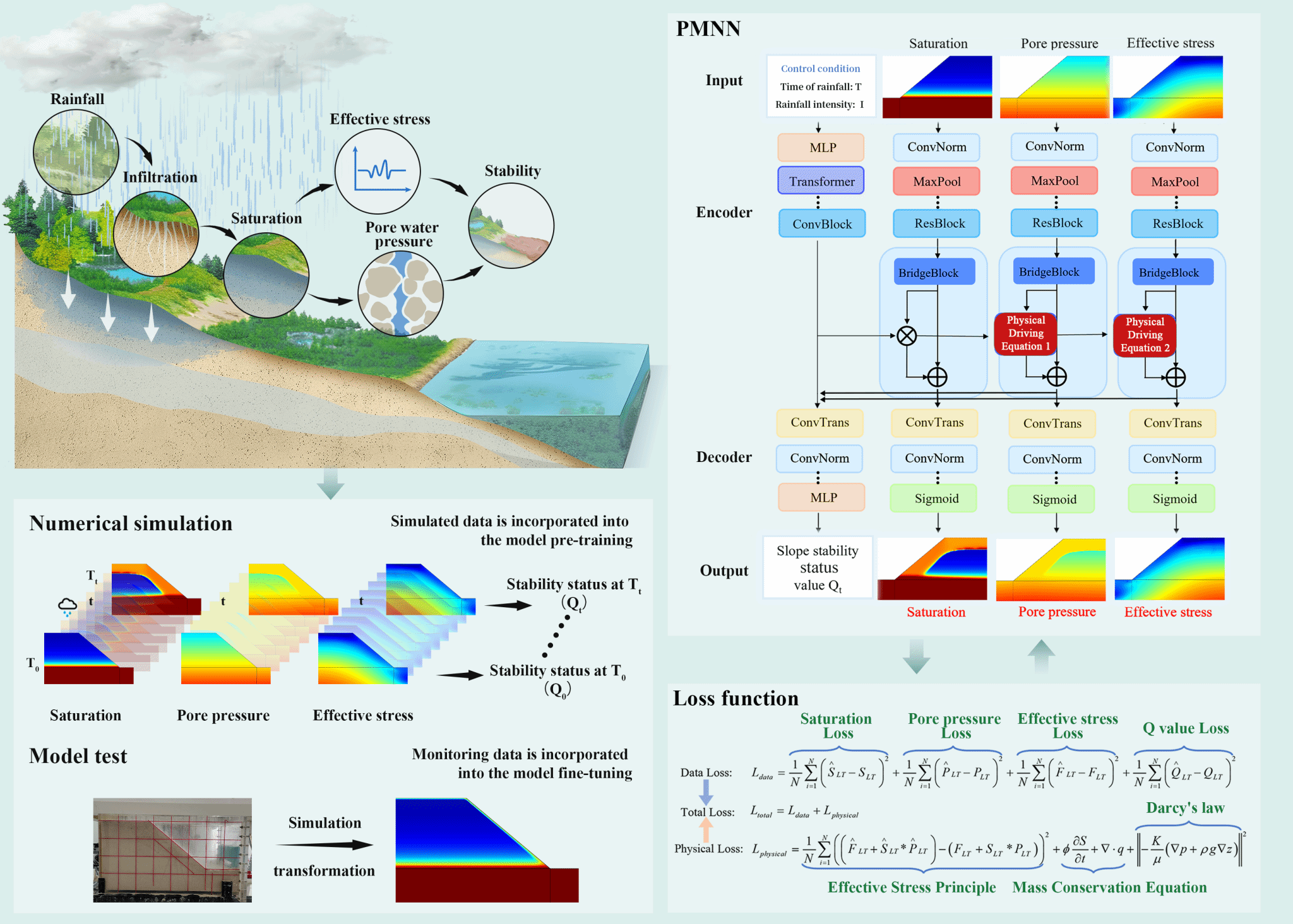 降雨诱发灾难性滑坡因其复杂的物理场耦合作用与高度非线性特征,其精准演化过程分析与灾变预警一直是防灾领域的重大挑战。现有数值法难以在复杂边界与极端降雨下兼顾精度与泛化;纯数据驱动模型则常缺乏显式物理约束与可解释性。针对这一难题,研究团队提出了一种基于“物理信息驱动—物理约束引导”的多模态多任务神经网络(PMNN)模型。该模型显式嵌入了包括van Genuchten渗流模型和Bishop有效应力方程在内的核心渗流与力学理论,并将质量守恒、达西定律等控制方程作为物理约束直接引入模型训练过程,从而确保预测结果既具备数据智能的灵活性,又遵循自然界的基本物理规律。
