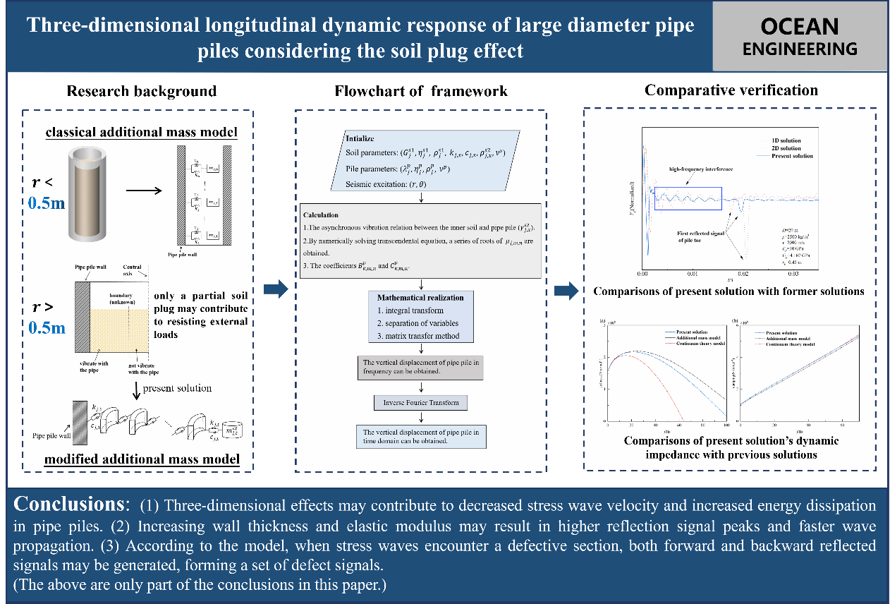 论文聚焦于海洋岩土工程中的核心理论问题——大直径开口管桩的动力响应。开口式管桩是港口、跨海大桥、海上风电等重大工程的“根基”,其在打入过程中桩管内形成的土塞,是影响桩基承载性能和长期安全的关键因素。传统的理论模型适用于内径小于0.5米的小直径管桩,对于现代大型工程中广泛使用的超大直径管桩,传统方法会因高估土塞效应而导致设计偏差。为解决这一工程痛点,课题研究团队首次引入了改进的附加质量模型,该模型创新性地考虑了在大直径条件下仅部分土塞参与抵抗荷载的物理机制,为相关工程实践提供了更精确的理论工具。
