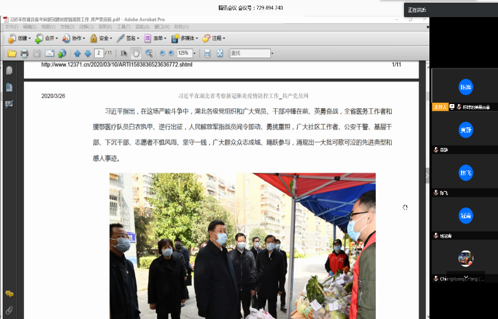 各支部书记带领党员认真学习习近平总书记在湖北省考察新冠肺炎疫情防控工作讲话精神,学习习近平总书记在决战决胜脱贫攻坚座谈会上的讲话精神,观看习近平总书记在疫情期间专门赴湖北省看望慰问奋战在一线的医务工作者、解放军指战员、社区工作者、公安干警、基层干部、下沉干部志愿者和居民群众时的视频、图片,观看中组部共产党员网“抗疫一线党旗红”专题网上的先进典型事迹。