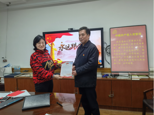 最后,全体党员为陈飞、张美霞和黄静三位同志过“政治生日”,为三位同志颁发“政治生日”纪念卡。